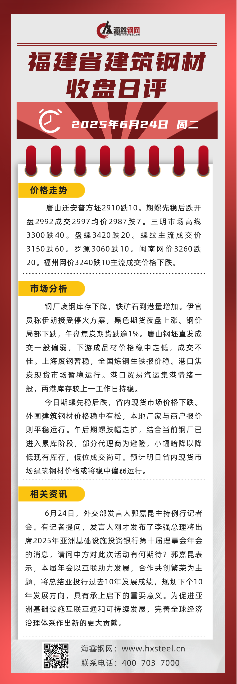 6月24日福建省內建筑鋼材收盤日評